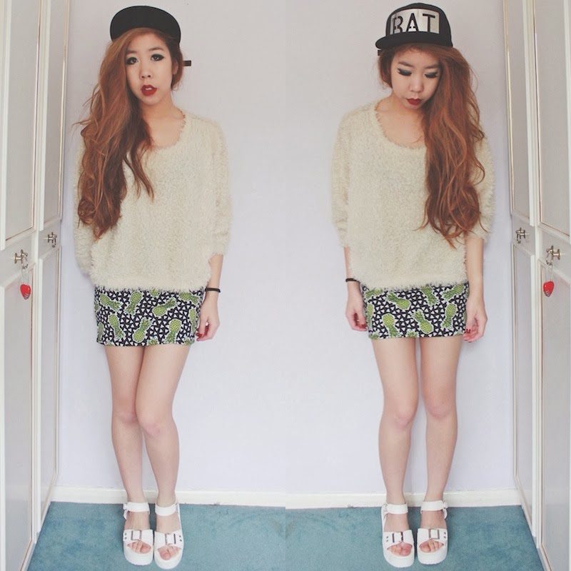 | Pineapple skirt from H&M; sweater from Topshop; cap from Forever 21; sandals from Yesstyle |